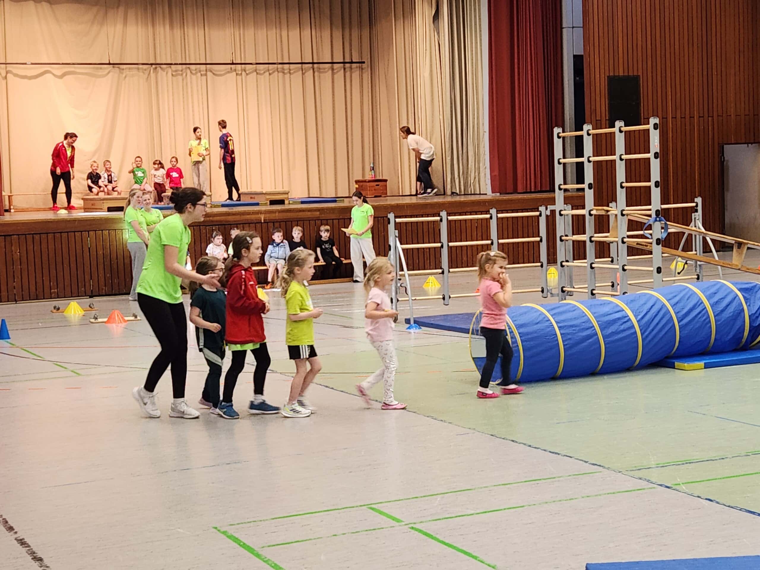 Über 30 kleine Turnerinnen und Turner gingen an den Start und meisterten mit großem Eifer die abwechslungsreichen Stationen. Mit dem Rollbrett sausten sie durch den Parcours, mutig krochen sie durch den langen Tunnel und bewiesen Balancegefühl auf der Hängebrücke sowie dem Schwebebalken. Auch bei Stecksprüngen und beim Dosenwerfen war Geschick und Konzentration gefragt. Den krönenden Abschluss bildete ein rasantes Wettrennen, bei dem noch einmal alle ihr Bestes gaben.